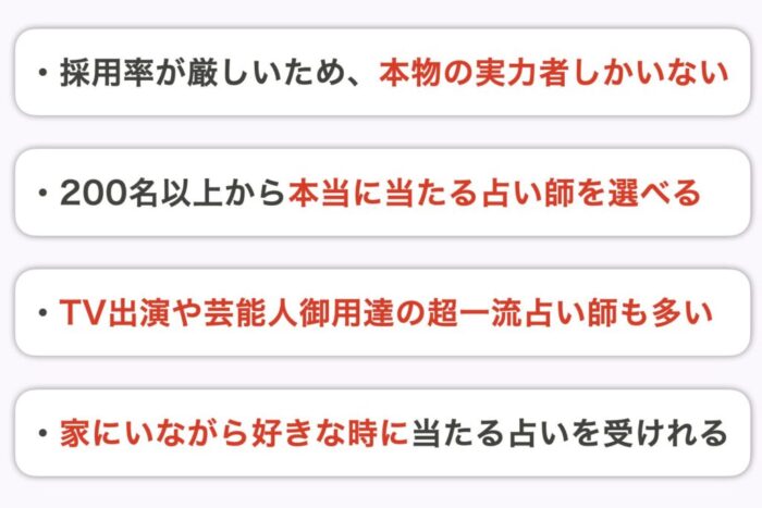 最近では占い師の採用率も厳しくなっており、本物の実力を持った占い師しか在籍できないため、占いの精度も非常に高くなっています。