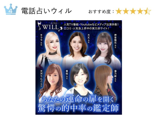 TVやメディア出演、芸能人も利用するほど高い実力を持った占い師が多数在籍する『電話占いウィル』。
